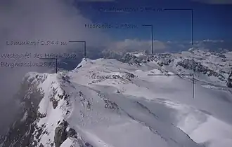 The Übergossene Alm is the summit region of the Hochkönig (2,941 m) in the Berchtesgaden Alps. It contains the remains of a glacier that used to cover almost the entire summit plateau; in 1888 around 5.5 km2 of the plateau was covered by an ice sheet.[2] Since then the glacial surface has melted until it now covers just 1.5 km2 and the glacier has split into three, small crevasse-free areas. The name of the glacier goes back to a local legend.