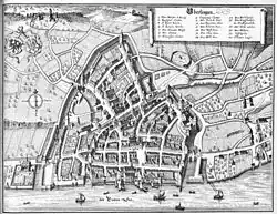 Troops of the French army arrived on 25 April 1945, and collected all the arms, munitions and weaponry in the city, to be stored in one of the former guild houses built in the 15th century. On the night of 2 May of the year, a fire destroyed the building and the western side of the market square. The fire is thought to have been started by a careless French sentry.[31]