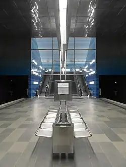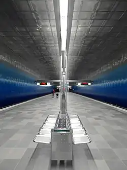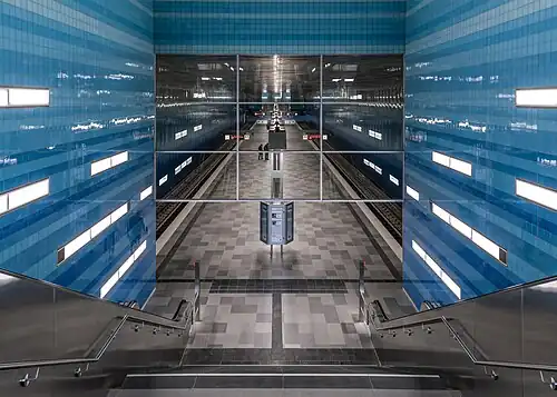 The stop was designed by the Netzwerkarchitekten architecture studio from Darmstadt. The walls are clad in blue ceramic-coated glass tiles that get darker the further down they go, recalling the undersea world. Silver-colored plates on the ceiling give the impression of a water surface.[3] This underwater theme ties in nicely with the fact that the neighborhood is next to the harbor, and with the name of the stop, which translates as "Overseas Quarter", where the overseas part would provide the seafaring theme, and a playful interpretation of "over-seas" could see the neighborhood as over the sea and the metro station as below it and hence underwater...
