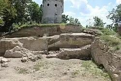 ![]() Ruins of medieval Čeklís Castle. Early 20th century water tower in the background | |