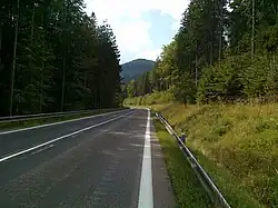 The eastern and southeastern slopes are traversed by the I/44 road connecting Šumperk and Jeseník. This road was originally laid out in the 19th century to connect with the then-developing tourist base at Červenohorské sedlo pass, and later in the 20th century, it was paved. To ease the incline of the slope, two road loops were built at elevations of 815 and 870 metres. From this road on the slopes of Červená hora, there are views towards many nearby peaks, including Jeřáb, Velký Klín, Velký Klín–JZ, and Velký Klínovec.[5]