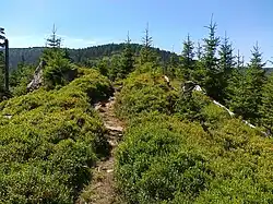 The main summit of Červená hora is not accessible by any marked tourist trail.[5] The summit is difficult to reach, situated in a small clearing surrounded by dense dwarf mountain pine and a few scattered spruce trees.[9][11] Due to the height of the dwarf pines, the summit offers only limited views. However, some of the visible peaks include Dlouhé stráně, Mravenečník, Medvědí hora, Malý Děd, Praděd, Petrovy kameny, Vysoká hole, and Velký Klínovec. At the summit, there is a triangulation station, marked on geodetic maps with the number 33, at an elevation of 1,332.61 metres above sea level, and the geographical coordinates of 50°08′39.27″N 17°08′09.46″E / 50.1442417°N 17.1359611°E / 50.1442417; 17.1359611.[8] Near this station, there is a steel post with a warning sign indicating that damaging the station is punishable by law.[8]