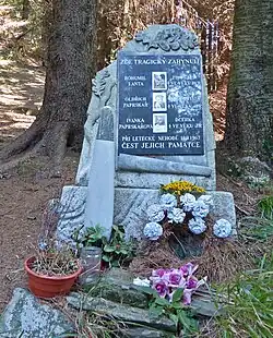 On 18 September 1967, a sports plane belonging to the Šumperk Aeroclub, an Orličan L-40 Meta Sokol model, crashed on the slope of Červená hora near the Červenohorské sedlo pass during a sightseeing flight.[4] On board, besides the pilot, was the four-member Paprskář family (a parachutist with his wife and two daughters). The crash claimed the lives of three people: the pilot Bohumil Lanta, the parachutist Oldřich Paprskář, and his three-year-old daughter Ivanka Paprskářová.[4] At the crash site, about 2.2 km southeast of the summit, at an elevation of around 1,024 metres, a memorial with a plaque listing the names of the deceased was erected along the road.[5]