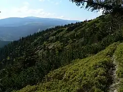 1. ^ The forest stand of the entire Jeseníky Protected Landscape Area includes: European spruce 84%, European beech 10%, European larch 1.5%, sycamore maple 1.1%, birch 1%, common alder 0.8%, dwarf mountain pine 0.4%, grey alder 0.3%, (European silver fir, European ash, and linden) 0.2%, Scotch pine 0.1%, and others (Pinus mugo, oak, hornbeam, Norway maple, elm, rowan, green alder, aspen, poplar, and goat willow) 0.2%.