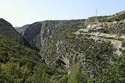 Čikola river's springs is near the village Čavoglave, flows through the city of Drniš and then flows near village of Miljevci into the river of Krka which flows into the Adriatic Sea. The canyon contrasts with the nearby mountains of Moseća, Promina, and Svilaja. The canyon is 14 km long and 170 m deep in places. It ends 3 km from the lake part of the river, i.e. 6 km before the mouth. Due to the diversity of flora and fauna, and more underwater caves that can be easily entered in summer when the river is partly dry, and even the rich historical heritage, Čikola canyon gained the status of a protected area in 1965.[2] In addition to its natural beauty, the Čikola canyon is known for its zipline, which stretches from 30 to 120 m above sea level and has a total length of 1.4 km, which makes it one of the longest ziplines in Croatia. Thrill enthusiasts can choose between three ziplines 250, 500 and 650 meters long, along which they can ride on a steel rope at speeds up to 70 km/h (~43 mph).[2]