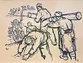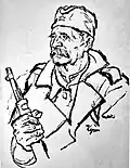 Kun's political activity was well known to the police, who registered him as a communist. After the start of the Second World War in September 1939 and during increased political unrest in the country, which culminated in large demonstrations in Belgrade on 14 December 1939, the Cvetković-Maček government established concentration camps for political opponents. On the basis of the Decree, by which the Viceroyalty authorized the government to change existing laws and regulations instead of the dissolved National Assembly, as well as pass new ones. Police forces were given the authority to forcibly move persons that "disturb national peace" or change their place of residence under the supervision of the authorities. Shortly after the adoption of the law, between December 1939 and January 1940, a group of 25 prominent communists were arrested in Belgrade. Among those arrested were Moša Pijade, Ivan Milutinović, Ivo Lola Ribar, Bora Baruh, Blagoje Nešković and Kun.[17] After spending some time in the prison of the Belgrade City Administration, those arrested were taken to the concentration camp in Bileća on 18 January 1940. Upon arrival at the camp, the prisoners, who were mostly members of the Communist Party of Yugoslavia, formed a party committee headed by Pijade, Milutinović and Todor Vujasinović. During his stay in the camp, Kun was told by Pijade that he had been accepted as a member of the KPJ. Although Kun was admitted to the KPJ in 1940, his activities started in 1939, according to Pijade.[18] Baruh, Pijade and Kun made various pencil drawings depicting prison life while in the camp.[19]