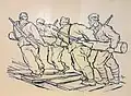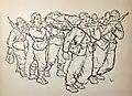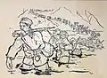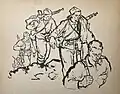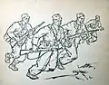 After waiting for two months Kun set off for southern France with smaller group, from where they crossed illegally into Spain. Immediately after his arrival, he underwent military training, during which he was chosen as the commander of Yugoslav volunteers. After completing the training, they were assigned to the International Battalion Đuro Đaković and sent to the front in Albacete. During his stay on the front line, in addition to participating in battle, he made drawings with motifs from the war. Later, at the insistence of Božidar Maslarić and Rodoljub Čolaković, he was transferred to the battalion headquarters. Later, as a cultural worker, he was transferred to the Headquarters of the 129th International Brigade. In Spain, he collaborated with Croatian journalist and writer August Cesarec and made seven drawings to illustrate his manuscript, published in Toronto in 1938 under the title Spanish Encounters (Španjolski susreti), a book of encounters with people and cities. In May 1938, by order of the KPJ, he was transferred from the front in Teruel to Barcelona, where he was informed that he had to return to Paris. In Barcelona, he had a meeting with Kosta Nađ. As he had no documents, he had to cross the border illegally.[15]