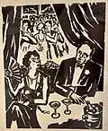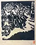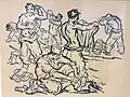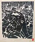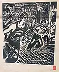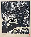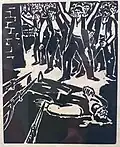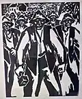 After returning to Belgrade, he created a set of graphics titled Blood-soaked Gold (Krvavo zlato) with the aim of displaying the lives of Yugoslav miners and workers. Although the collection was finished, he was unable to find a printer in Belgrade who would print his work. He printed 10 copies of the collection in his studio in 1936. With the help of architecture student Voja Midić, he reached printer Jovan Luks from Stari Bečej, who agreed to print the collection.[12] In January 1937, the first 250 copies were printed, and soon after, a second edition of 1,000 copies was published, which the writer Jovan Popović wrote the foreword for. The map of graphics depicting the difficult daily life of miners and arduous work, as well as the dissolute life of profiteers, was banned by the Belgrade City Administration in February of 1937.[1][13]