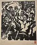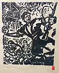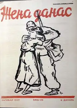 While an apprentice in his father workshop, Đorde liked to socialise with the workers, and he subsequently joined the Association of Graphic Workers.[9] In 1923 he painted a poster for the International Workers' Day celebration, which was printed and put up around the city and in streetcars. Kun's interest in left-wing ideas and communism most likely arose during his stay in Paris, where he received books on Lenin and the Soviet Union from friends. Through his wife Nada he began to associate with communists and members of the then illegal Communist Party of Yugoslavia (KPJ). Left-wing ideas did not affect his artistic expression prior to 1934. The conference of the International Association of Revolutionary Writers, held in 1930 in Kharkiv, and the First Congress of Soviet Writers, held in August 1934 in Moscow, defined the concept of socialist realism, an artistic style with the aim of spreading communist and socialist ideas, which highly influenced Kun's artistic output from that point onwards.[1][7]