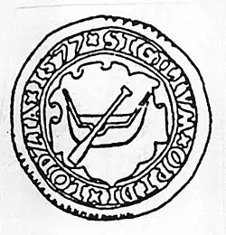 Łódź first appears in a 1332 written record issued by Władysław the Hunchback, Duke of Łęczyca, which transferred the village of Łodzia to the Bishopric of Włocławek.[19] The document enumerated the privileges of its inhabitants, notably the right to graze land, establish pastures and engage in logging.[20] In 1423, King of Poland Władysław II Jagiełło officially granted town rights to the village under Magdeburg Law.[21] For centuries, it remained a small remote settlement situated among woodlands and marshes, which was privately held by the Kuyavian bishops.[22] It was administratively located in the Brzeziny County in the Łęczyca Voivodeship in the Greater Poland Province of the Kingdom of Poland.[23] The economy was predominantly driven by agriculture and farming until the 19th century.[24] The earliest two versions of the coat of arms appeared on seal emblems in 1535 and 1577, with the latter illustrating a boat-like vessel and a turned oar.[25]