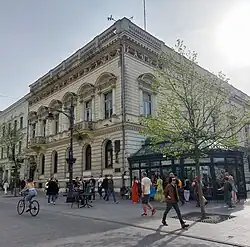 The infrastructure and edifices of Łódź were built at the expense of industrialists and business magnates, chiefly Karl Wilhelm Scheibler and Izrael Poznański, who sponsored schools, hospitals, orphanages, and places of worship.[39] From 1872 to 1892, Poznański established a major textile manufactory composed of twelve factories, power plants, worker tenements, a private fire station, and a large eclectic palace.[40] By the end of the century, Scheibler's Księży Młyn became one of Europe's largest industrial complexes, employing 5,000 workers within a single facility.[41] The years 1870–1890 saw the most intense industrialisation,[42] which was marked by social inequalities and dire working conditions.[43] Łódź soon became a notable centre of the socialist movement and the so-called Łódź rebellion(pl) in May 1892 was quelled by a military intervention.[43]