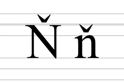 The grapheme Ň (minuscule: ň) is a letter in the Czech, Slovak and Turkmen alphabets. It is formed from Latin N with the addition of a caron (háček in Czech and mäkčeň in Slovak) and follows plain N in the alphabet. Ň and ň are at Unicode codepoints U+0147 and U+0148, respectively.[1][2]