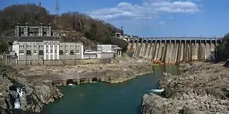 Built in 1924, the Ōi Dam was the first dam built anywhere on the Kiso River system. It is also the first full-scale hydroelectric dam built in Japan.[1] At 53.4 m (175.2 ft) tall,[2] it is the largest gravity dam in Japan after the Taishakugawa Dam in Hiroshima Prefecture. In 1983, the New Ōi Dam (新大井ダム Shin-Ōi Damu) was built just downstream. Combined, they produce 80,000 kW of power.