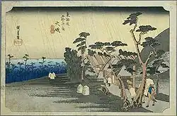 The classic ukiyo-e print by Andō Hiroshige (Hōeidō edition) from 1831–1834 depicts travelers in straw raincoats entering a village by the ocean during pouring rain. One is mounted, and the other is on foot. The road is lined with pine trees. By contrast, the Kyōka edition of the late 1830s depicts a prosperous village overlooking a wide expanse of Sagami Bay with the mountains of the Izu Peninsula on the far shore.