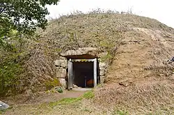 The Ōiwayama Kofun Cluster consists 17 confirmed tumuli, from the latter half of the 3rd century to the 6th century AD, or spanning the end of the Yayoi to the end of the Kofun period. Of these tumuli, the Maruyama Kofun (円山古墳), a "two conjoined rectangles" type (zenpō-kōhō-fun (前方後方墳)) and Kabutoyama Kofun (甲山古墳), a circular-type (empun (円墳)) which has the largest stone burial chamber in Shiga Prefecture, were designated as National Historic Sites in 1941. The Toba Kofun (冨波古墳), another zenpō-kōhō-fun was discovered in 1982 and added to the National Historic Site designation the same year. In 1985, six previously unknown tumuli were discovered and were also added to the area under protection, which then received the collective name of "Ōiwayama Kofun Cluster". The borders of the area under protection were adjusted in 1995. The site is now part of the Sakuraba-sama Historical Park, and is a short walk from the "Dotaku Museum Mae" bus stop on the Omi Railway bus from Yasu Station on the JR West Tōkaidō Main Line.[2] Artifacts uncovered during archaeological excavations have included bronze mirrors, earthenware, haniwa and Sue ware pottery.
