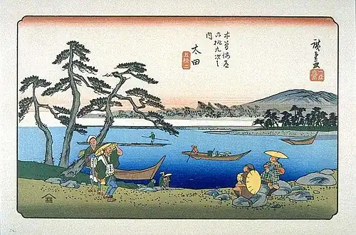 Utagawa Hiroshige's ukiyo-e print of Ōta-juku dates from 1835 -1838. The print depicts travelers gathered at the shore of the Hida River waiting to make the crossing by ferry, which can be seen midstream. Also on the river is a man poling a raft made from timber, with lumber being one of the major products of Hida Province upstream. An elderly couple, with pilgrim's staves and knapsack observe the scene, while two young men are seated on boulders waiting for the ferry to arrive. In the distance on the far right shore is Mount Hotobuki.