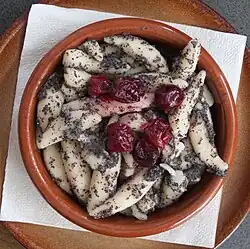 Šúľance[1] (Slovak pronunciation: ['ʂuːʎantse], literally Rolls, singular: šúľanec,[1] dialectally bedere, cibliky, cikoški, kokocíky, kokoški, kokošky,[2] šuferle[3] or škorce) are Slovak potato gnocchi typically prepared with sugar or poppy seeds. The name of the dish comes from the Slovak word šúľať, which means “to roll”.