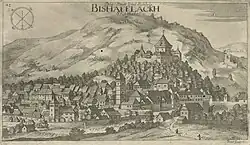 In 973, the lordship of Škofja Loka was granted by Emperor Otto II to the Bishops of Freising, and for the next one thousand years the history of the town was tied to that of the distant ecclesiastical principality.[8][9] A castle and tower were built above the town for defense purposes and later became the residence of the bishop's governor. In the 11th or 12th century. Emperor Otto III granted the bishops the right to mint coinage and collect tolls. Škofja Loka was first mentioned as having market rights in 1248, and having town rights in 1274.