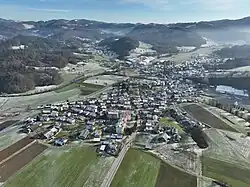 Šmartno pri Litiji (pronounced [ˈʃmaːɾtnɔ pɾi liˈtiːji]; German: Sankt Martin)[2] is a town in the Litija Basin in central Slovenia. It is part of the traditional region of Lower Carniola and is now included in the Central Slovenia Statistical Region. It is the seat of the Municipality of Šmartno pri Litiji. The town is located 3 km southeast of Litija at the confluence of three creeks: Reka Creek, Black Creek (Slovene: Črni potok), and Kostrevnica Creek (Slovene: Kostrevniški potok). The town of Litija outgrew the formerly more important Šmartno when the Austrian Southern Railway was routed through Litija. The name of the settlement was first attested in ecclesiastical documents from 1135, although the area was already settled in prehistoric times. The oldest house in Šmartno pri Litiji bears the year 1580, and in the 17th century the Mollerey painting and graphic arts workshop operated in it.[3] The town includes the hamlet of Slatina (in older sources also Slatna,[2] German: Slatenegg[2]).