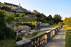 The Ferrari Garden (Slovene: Ferrarijev vrt) is a major landmark in the settlement and one of the most visited ones. It was designed by Max Fabiani at the request of the physician Enrico Ferrari in the 1920s.[8] The garden is located below the village, next to a villa, and houses a small pool with an island which is connected by a bridge to the shore. The location is popular among tourists because of its design and the view it offers of the Karst landscape below.[9] The park has been declared a natural park and a national monument by the Government of Slovenia.