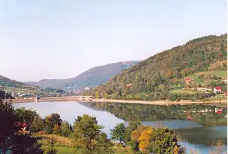 Żywiec Lake (Polish: Jezioro Żywieckie) is a reservoir on the Soła river in southern Poland, near the town of Żywiec. It was created in 1966, when several villages in the area, such as Zarzecze, Tresna, Zadziel and Old Żywiec were flooded following the construction of a dam. The lake has the area of around 10 square kilometres, and the earth-filled dam is 39 metres high and 310 metres long. The maximum depth of the lake is 26.8 metres (88 ft), and the average depth is 8.6 metres (28 ft). Near the dam there is a hydro-electric power plant with the capacity of 21 megawatts (28,000 hp). Żywiec Lake is used mostly for tourist purposes, to regulate the flow of water, and to protect the area from flooding.