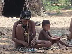 The ǃKung (/ˈkʊŋ/[1][a] KUUNG) are one of the San peoples who live mostly on the western edge of the Kalahari desert, Ovamboland (northern Namibia and southern Angola), and Botswana.[2] The names ǃKung (ǃXun) and Ju are variant words for 'people', preferred by different ǃKung groups. This band level society used traditional methods of hunting and gathering for subsistence up until the 1970s.[3] Today, the great majority of ǃKung people live in the villages of Bantu pastoralists and European ranchers.[2]