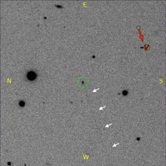 On July 7, 2021, 2005 QN173 was found to be active by the Asteroid Terrestrial-impact Last Alert System survey.[6] Archival imagery showed it had been active during a previous perihelion passage,[8] dated July 22, 2016.[9] This indicates the activity is due to the sublimation of icy volatiles,[6] as is common with comets.[9] At the time that activity was identified, the object displayed a long, dusty tail, much like a comet. Follow up observations found this tail extended more than 9 along its orbital plane.[7] By August 14, 2021, the coma around the nucleus was fading, while the brightness of the tail remained roughly constant.[6]