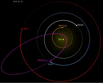 (276033) 2002 AJ129, provisional designation 2002 AJ129, is a Mercury-crossing asteroid. It has the ninth-smallest perihelion of all numbered asteroids, after asteroids such as 2000 BD19, 2004 UL, and 2008 XM.[6] It makes close approaches to all of the inner planets[3] and asteroid 4 Vesta.[7] The asteroid is estimated to be between 0.5–1.2 kilometers (0.3–0.7 mi) across.[5] In January 2018 there was much media hype about this asteroid being classified as a potentially hazardous asteroid, although there is no known threat of an impact for hundreds if not thousands of years. The media has compared the size of the asteroid to the Burj Khalifa in Dubai.[8]