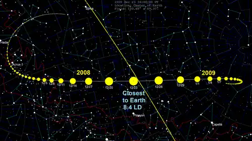 On 23 December 2008, 2008 EV5 made a close approach to Earth at a distance of 8.4 lunar distances (0.022 AU, 3.2 million km), its closest until 2169.[3] Its brightness peaked on 26 December about 13.2 magnitude.