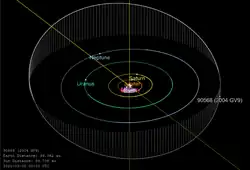 (90568) 2004 GV9 (provisional designation 2004 GV9) is a large trans-Neptunian planetoid that was discovered in 2004 by the Near Earth Asteroid Tracking survey at Palomar Observatory.[10] It is classified as a classical Kuiper belt object of the dynamically "hot" population, which follow highly inclined or eccentric orbits around the Sun.[3]: 2