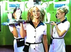 The song's accompanying music video (which uses The Stop Remix!) was directed by Nigel Dick and filmed on June 14 and 15, 1999 at the AES Power Station in Redondo Beach, California.[44] Spears conceptualized the video's treatment, and explained during an interview with MTV in 1999 that "it would be cool to be in a club, and we're dorky waitresses, and we break out and start dancing."[44] At the time, Spears expected that the video would take her "to the next level".[44] To promote the film Drive Me Crazy, actors Adrian Grenier and Melissa Joan Hart were invited to make cameo appearances in the video, since the song had been included on the film's soundtrack, however, Grenier did not want to participate.[44] Dick commented on the issue, saying, "I was given instructions to ring him up and make sure he appeared in the video. I said, 'You know what, Adrian, I just think it would be great for your career, and Britney's a great girl and she's fun to work with.' Eventually he came around."[44] Dick also revealed that he was impressed by the singer's work ethic, adding that she "came to the set completely rehearsed."[44] The music video premiered on MTV's Making the Video special that aired on July 18, 1999.[45] Due to Hart's appearance in the music video, parts of it were featured in the credits of "No Place Like Home", the season 4 premiere of Sabrina the Teenage Witch, an episode that guest starred Spears.