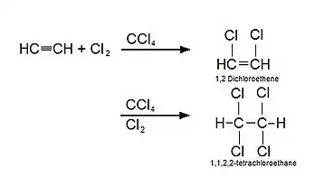 There are a few different ways to synthesise 1,1,2,2-tetrachloroethane. 1,1,2,2-tetrachloroethane can be produced by the catalytic addition of chlorine to ethylene which yields the highest purity.[10] It is also produced by direct chlorination or oxychlorination utilizing ethylene as feedstock and by catalytic chlorination of ethane or chlorination of 1,2- dichloroethane.[8] 1,1,2,2-Tetrachloroethane is always produced in closed systems to obtain the highest yield. Common side products that are created during the synthesis of 1,1,2,2-tetrachloroethane are 1,2-Dichloroethane and trichloroethylene (in the presence of heat).[11]