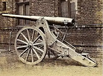 An early modification to make the guns suitable for field use was the fitting of Bonagente grousers to the wheels to improve balance and reduce ground pressure on soft ground. A bonus was they slowed recoil and didn't require extensive site preparation to bring the guns into action. For transport, the gun was attached to a limber for towing by a horse team or artillery tractor.[2]