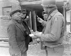 After a period of mopping up and consolidation, it participated in the trap of enemy troops in the Ruhr pocket. The 104th repulsed heavy attacks near Medebach and captured Paderborn on 1 April 1945.[18] After regrouping, it advanced to the east and crossed the Weser River on 8 April, blocking enemy exits from the Harz Mountains. On 11 April 1945 the Division was involved in the liberation of a large German concentration camp at Nordhausen.[21] The division then crossed the Saale River and took Halle in a bitter five-day struggle from 15 to 19 April.[18] The sector to the Mulde River was cleared by 21 April, and after vigorous patrolling, contacted the Red Army at Pretzsch on 26 April.[18] The division took temporary command of assets from the 69th Infantry Division in early May.[19]