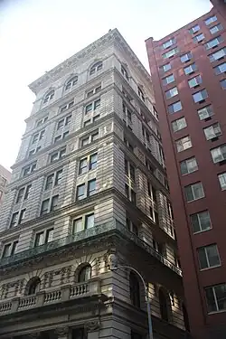 The company decided in August 1893 to hire Hatch, who was less well-known than the other competitors, to design the annex.[98] Plans for the annex were filed in April 1894.[99][100] The project would also involve masonry contractor L. W. Armstrong, marble contractor Norcross Company, iron contractor Post and McCord, and carpenter E. Hilbrand.[100] Construction commenced in May 1894, but Hatch died three months later, before construction was completed.[27][98] After Hatch's death, McKim, Mead & White took over the project,[90][2] designing an annex that extended about 200 ft (61 m) west from Elm Street.[101] The annex ultimately cost $1.5 million to construct.[16] The Merchant's Club moved into the top two stories of the annex, which opened in February 1896.[68] The New-York Tribune wrote that the structure would be "one of the most striking improvements in Broadway" south of Canal Street.[101] The New York Times described the New York Life Building as being in a "rivalry" with the Central National Bank Building to the south, at Pearl Street and Broadway.[29]