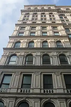 The remainder of the Leonard Street elevation is divided by band courses at the same levels as on the Lafayette Street pavilion.[23] There are nine bays to the west of the entrance pavilion, excluding the Broadway pavilion. In the western bays, the 1st and 2nd stories contain square-headed windows with composite columns between them. There are seven such bays to the east of the entrance pavilion, excluding the Lafayette Street pavilion.[32] These bays contain double-height archways on the 1st and 2nd stories, since these originally overlooked the general office.[31] The windows on the other stories are separated by flat pilasters; the windows on the 3rd, 4th, 10th, and 12th stories are round-arched, while the other windows are square-headed.[32] Above the 12th story is a balustrade with a parapet.[31]