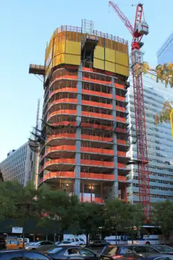 The tower was constructed at the site of the former St. John's University building at 101 Murray Street, which the developers purchased for $200 million in May 2013. In May 2015, the developers finalized the project's financing after securing an equity investment from a Chinese insurance company and a $445 million construction loan from The Blackstone Group, Deutsche Bank, and M&T Bank.[4][5] By summer 2015, demolition of the previous structure was complete and construction of the foundation commenced. The building topped out in 2018.[6]