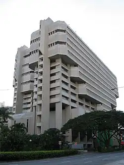 The ground floor of the building was dedicated to public access and use for retail as well.[9] It is entered via wide steps under columns that are three- or four-storeys high,[3] and these pilotis create a sense of space for the naturally ventilated public lobby areas.[2] From the concourse, which is decorated with wall-relief sculptures, steps lead to upper and lower public service areas, a cafeteria and carparks.[9]