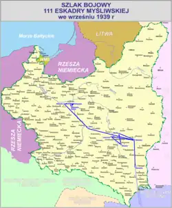 In 1939 it was attached to the Pursuit Brigade,[1] a large fighter unit held in reserve of the Commander in Chief. As part of the Polish 3rd Squadron of the 1st Air Regiment (Polish: III/1 dywizjon myśliwski) under Zdzisław Krasnodębski, the unit was stationed at the airfield at Zielonka and provided air cover for the nearby city of Warsaw. During the Polish September Campaign the first sortie — and the first success of the escadrille — took place on September 1, at 4 in the morning, that is roughly an hour before the fights for Westerplatte started, an event which is usually taken as the starting point of World War II. The escadrille was scrambled to intercept a large formation of enemy bombers escorted by Messerschmitt Bf 110 heavy fighters. Over the area of Modlin the enemy formation was intercepted and forced to retreat, dropping their bombs on uninhabited areas. Lt. Palusiński downed one enemy Dornier Do 17 and probably damaged another plane of that type.[3] Palusiński himself was wounded by enemy fire.