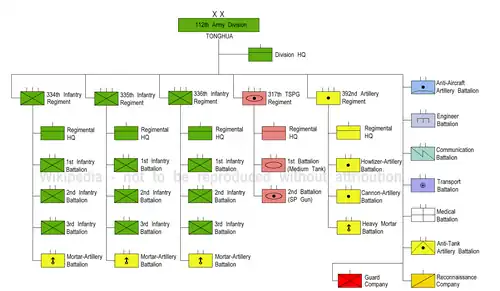 Since 1950 it became a military formation of the People's Volunteer Army (People's Volunteer Army (PVA) or Chinese Communist Forces (CCF)) during the Korean War with a standard strength of approximately 10,000 men. It was a component of the 38th Corps, consisting of the 334th, 335th, and 336th Regiments.[3]
