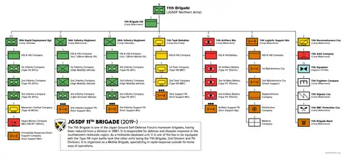 The 11th Brigade (Japanese: 第11旅団) is one of eight active brigades of the Japan Ground Self-Defense Force. The brigade is subordinated to the Northern Army and is headquartered in Sapporo, Hokkaidō. Its responsibility is the defense of South Western Hokkaidō.