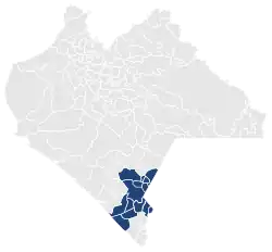 Under the 2023 districting plan adopted by the National Electoral Institute (INE), which is to be used for the 2024, 2027 and 2030 federal elections,[7] the 11th district comprises 132 electoral precincts (secciones electorales) across 11 municipalities:[8][9]