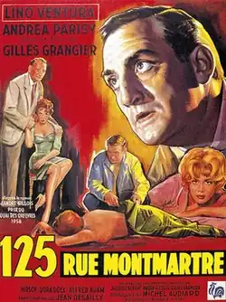 125 Rue Montmartre is a 1959 French crime drama film directed by Gilles Grangier and starring Lino Ventura, Andréa Parisy and Robert Hirsch.[1][2][3] It was shot at the Boulogne Studios in Paris and location shooting around Montmartre. The film's sets were designed by the art director Robert Bouladoux.
