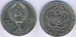 Before the festival, posters, postage stamps with festival symbols, a commemorative coin were issued and a special promotional campaign was held by the Soviet state lottery. The poster and symbols of the festival were approved by the Central Committee of the CPSU.
