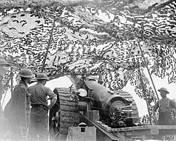 While at La Houssoye the battery was visited by the official war photographer John Warwick Brooke, several of whose pictures of the battery are in the collection of the Imperial War Museum. On 29 August 135th Siege Bty was assigned to 27th Heavy Artillery Group (HAG).[10] At that stage of the war a heavy artillery group (HAG) was a lieutenant-colonel's command controlling a fluctuating number of RGA heavy and siege batteries.[11] The battery was temporarily split up and attached to experienced batteries for initiation into front-line service. Left Half Battery was attached to 19th Siege Bty (of 27th HAG) outside Mametz, Right Half Battery to 57th Siege Bty (of 30th HAG) with No 1 gun near Contalmaison with the forward section, and No 2 gun at Fricourt with the rear section. These batteries were supporting Fourth Army conducting the Somme Offensive; although the gun positions were rarely under fire, the forward observation officers (FOOs) and signallers were in Observation Posts (OPs) in the midst of fighting in High Wood and Delville Wood. After a month the battery was pulled out on 21 September, but immediately sent forward to new positions, with Right Half to 67th Siege Bty and Left Half to 47th Siege Bty, both close to Montauban in XV Corps' Heavy Artillery. From these positions the battery supported the attacks of September that cleared High Wood and Delville Wood, and captured Flers, Guillemont and Ginchy, and then Gueudecourt.[10][12][13][14][15]