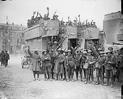 The Allies carried out a series of coordinated attacks along the Western Front on 26–29 September, including an assault crossing of part of the Canal du Nord. On 30 September 111th Bde found that the German bridgehead at Banteux had been abandoned, and closed up to form an outpost line along the bank of the Escaut Canal. 13th RB cautiously pushed patrols across the canal, but on 5 October the enemy retreated and 13th RB was able to send two platoons across unhindered, followed by the rest of the battalion crossing by closing the lock gates and using them as a bridge; 13th KRRC alongside had to make do with a single plank. The two battalions advanced until they met opposition along the Beaurevoir Line. 37th Division assaulted this line as part of the Battle of Cambrai on 8 October. 13th RB's role was to escort the tanks of 12th Battalion, Tank Corps, while C Company was held ready to support 10th RF's attack, though it was not engaged. Many prisoners were taken, the escort of one tank rounding up 80 alone. 37th Division's advance now became a pursuit of the beaten enemy to the River Selle, but 111th Bde was withdrawn for rest, with 13th RB spending 10 days at Ligny-en-Cambrésis among liberated French civilians.[8][9][96][97][98][99][100][101]