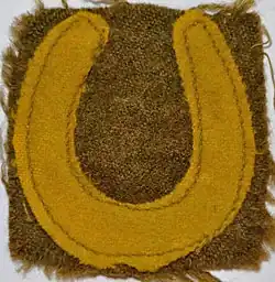 37th Division's formation sign was originally a gold horseshoe pointing downwards; in November 1916 this was changed to point upwards. In 1916 the Division adopted a system of 'battle patches' on the upper arm to identify individual units and subunits. These were based on brigade colours (111th Bde wore blue), geometric shapes for battalions, and horizontal stripes to indicate companies. For 13th RB the shape was a blue equilateral triangle worn beneath the divisional badge. Initially the battalion wore coloured company stripes on the shoulder strap beneath a blackened metal 'RB" title. These stripes were red for A Company, dark blue for B, purple for C and green for D. Later in the war they were moved to the shoulder above the divisional sign.[124][125][20]