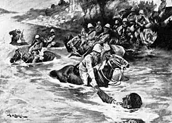 In February 1810 the regiment sailed for Lisbon for service in the Peninsular War.[11] It took part in the Battle of Campo Maior on the Spanish-Portuguese border on 25 March 1811 in a clash that occurred between British and Portuguese cavalry, under Robert Ballard Long, and a force of French infantry and cavalry under General Latour-Maubourg. The regiment, two and a half squadrons strong, led by Colonel Michael Head, charged and routed a superior French cavalry force of no less than six squadrons.[12] The regiment, with two Portuguese squadrons, then went on to pursue the French for seven miles to the outskirts of Badajoz.[13] The report reaching Lord Wellington seems to have glossed over the epic quality of the charge and emphasised the overlong pursuit. After receiving Marshal Beresford's report, Wellington issued a particularly harsh reprimand to the regiment calling them "a rabble" and threatening to remove their horses from them and send the regiment to do duty at Lisbon. The officers of the regiment then wrote a collective letter to Wellington detailing the particulars of the action. Wellington is reported as saying that had he known the full facts he would never have issued the reprimand.[14] The historian Sir John Fortescue wrote, "Of the performance of Thirteenth, who did not exceed two hundred men, in defeating twice or thrice their numbers single-handed, it is difficult to speak too highly."[15]