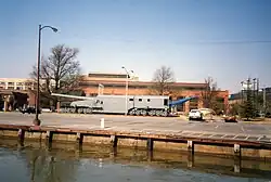 The gun car was positioned over the pit, the wheels were locked and the platform was locked into position with gun mount and car's weight shifted from the trucks (bogies) directly to the ground by jacks and lifting screws. The rails were removed from above the pit because the gun breech was too wide to pass between them.[9] The gun could elevate up to 43°, which gave it a maximum range of 42,000 yards (23.8 miles/38.4 km), and could be traversed 2.5° left and right of center. Any greater change of direction required the gun to be moved forward or backward along its curved track and a new recoil pit dug. The gun used the standard naval gun mounting and recoil system, with the addition of a pneumatic system to assist the runout springs to return the gun to firing position after recoil at the higher maximum elevation of 43° compared to maximum 30° in naval use.[10]