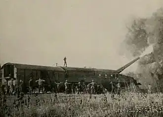 Each battery composed of a locomotive, gun car, ammunition cars, supporting equipment cars, and accommodation cars for the crew. Each train was under the command of a United States Navy lieutenant, and under overall command of Rear Admiral Charles Peshall Plunkett. After delivery by ship, these trains were assembled in St. Nazaire in August.[5]